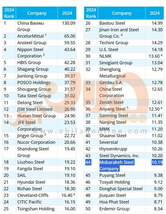 رتبه نخست این فهرست را گروه چینی بائو با تولید 130میلیون و 90هزار تن فولاد میانی در سال 2024 در اختیار دارد.