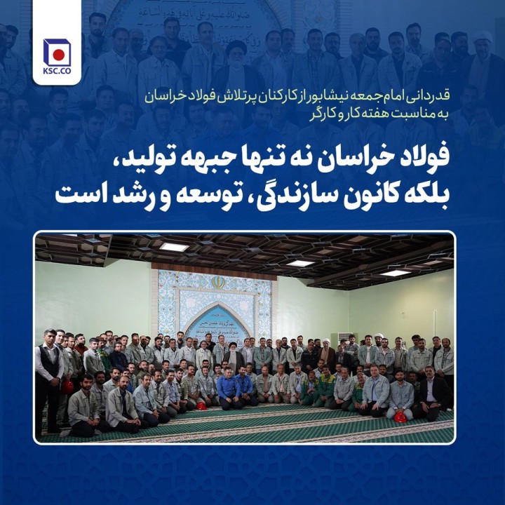 گفتنی است نماز ظهر و عصر امروز شنبه 13 اردیبهشت‌ماه در مخل نمازخانه فولاد خراسان به مناسبت روز کارگر به امامت حجت‌الاسلام یعقوبی اقامه شد.