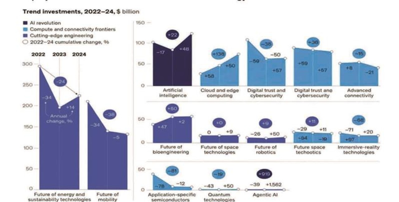 رضایت مشتری از طریق نوآوری به‌شدت افزایش می‌یابد. کسب‌وکارهایی که نیازهای مشتریان را پیش‌بینی کرده و به‌طور خلاقانه به آن‌ها پاسخ می‌دهند، می‌توانند محصولات مرتبط‌تر و خدمات سفارشی‌تری ارائه دهند. این امر به روابط قوی‌تر و حفظ بیشتر مشتریان منجر می‌شود. نوآوری در بازاریابی، مانند کمپین‌های دیجیتال شخصی‌سازی‌شده، دامنه دسترسی و تعامل را گسترش می‌دهد. این توانایی برای برقراری ارتباط معنادار با مشتریان، نوآوران را متمایز کرده و در بازارهای پویا، یک مزیت دفاعی قدرتمند ایجاد می‌کند. نوآوری برای تاب‌آوری کسب‌وکار و رشد بلندمدت حیاتی است. شرکت‌هایی که فرهنگ نوآوری مستمر را در خود نهادینه کرده‌اند، برای مقاومت در برابر شوک‌های اقتصادی و تلاطم‌های بازار، موقعیت بهتری دارند. آن‌ها با بازآفرینی مدل‌های عملیاتی خود، در هنگام مواجهه با تحولات فناورانه یا تغییرات نظارتی، مرتبط باقی می‌مانند. این امر با تعبیه کردن «انطباق‌پذیری» در DNA شرکت، یک مزیت رقابتی پایدار را پشتیبانی می‌کند. فراتر از شرکت‌های فردی، نوآوری به موتور محرک توسعه اقتصادی گسترده‌تر تبدیل می‌شود. در سطح کلان، صنایع نوآور شغل‌های با ارزش بالا ایجاد کرده، کارآفرینی را تقویت و سرمایه‌گذاری را تحریک می‌کنند. دولت‌ها با ایجاد اکوسیستم‌های نوآوری که همکاری بین دانشگاه‌ها، استارت‌آپ‌ها و شرکت‌های بزرگ را ترویج می‌دهد، این فرایند را تسریع می‌بخشند. مشارکت در این اکوسیستم‌ها، دسترسی به ایده‌های پیشرو و همکاری‌های حیاتی را برای موفقیت در نوآوری فراهم می‌کند. آینده نوآوری در کسب‌وکار بر فناوری‌های نوظهور متمرکز است، اما جریان سرمایه‌گذاری در این حوزه‌ها، تصویری پیچیده‌تر و دقیق‌تر از اولویت‌های بازار را به نمایش می‌گذارد. همان‌طور که در شکل شماره 1 نشان داده شده است، داده‌های مکنزی (McKinsey) برای سال 2024 نشان می‌دهد که سرمایه‌گذاری سهام در ده روند از سیزده روند اصلی فناوری افزایش یافته است. به‌طور مشخص، هوش مصنوعی، رایانش ابری و مهندسی زیستی شاهد رشد چشمگیر سرمایه‌گذاری بوده‌اند که نشان‌دهنده اعتماد بالای بازار به این حوزه‌هاست. در مقابل، فناوری‌هایی مانند واقعیت فراگیر (Immersive Reality)، فناوری‌های پایداری و نیمه‌هادی‌های خاص با کاهش قابل‌توجهی در سرمایه‌گذاری مواجه شدند. این واگرایی نشان می‌دهد که در سال 2024، بازار سرمایه به‌طور استراتژیک بر روی نوآوری‌هایی با مسیر تجاری‌سازی کوتاه‌تر و بازدهی قابل پیش‌بینی‌تر تمرکز کرده است. در نهایت، نوآوری در دنیای امروز دیگر یک فعالیت جانبی یا پروژه‌ای محدود نیست، بلکه به فرهنگ و شریان حیاتی سازمان‌های پیشرو تبدیل شده است. شرکت‌هایی که در آینده موفق خواهند بود، آن‌هایی نیستند که صرفاً محصولات دیروز را بهتر می‌سازند، بلکه آن‌هایی هستند که با جسارت، محصولات و بازارهای فردا را خلق می‌کنند. در این رقابت بی‌پایان برای بازآفرینی، نوآوری تنها یک ابزار نیست؛ بلکه خودِ استراتژی است؛ استراتژی‌ای که مرز بین رشد پایدار و فراموش شدن در تاریخ را ترسیم می‌کند.